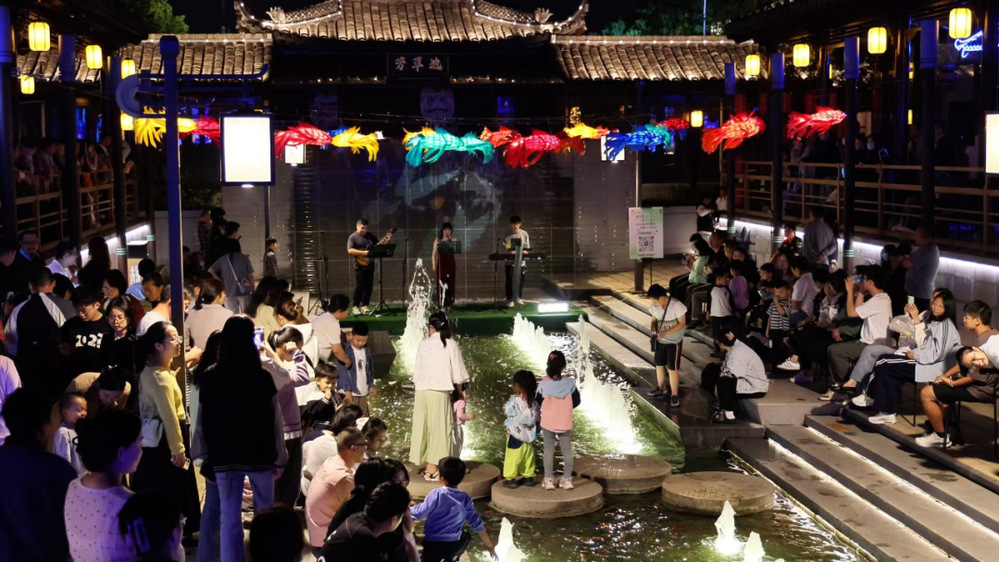 市集之上,音樂(lè)聲與歡笑聲交織回蕩。樂(lè)隊(duì)的精彩演繹中,動(dòng)感旋律瞬間點(diǎn)燃觀眾熱情,不少市民、游客主動(dòng)登臺(tái)獻(xiàn)唱,沉浸式享受熱鬧氛圍;古運(yùn)河邊軒窗輕啟,舞者于窗前水袖翻飛,不時(shí)與河邊游客互動(dòng),為喧鬧市集注入了鮮活靈動(dòng)的氣息。
