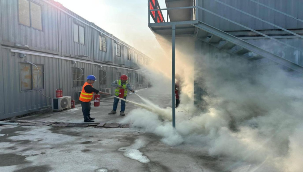 本次培訓(xùn)邀請消防安全專家進(jìn)行授課。演練前,專家詳細(xì)講解了火災(zāi)報(bào)警流程、初期火災(zāi)撲救技巧、疏散逃生注意事項(xiàng)等核心知識,重點(diǎn)演示了滅火器“提、拔、握、壓”的正確操作方法,同時明確了疏散引導(dǎo)員、滅火行動組的職責(zé)分工,劃定了安全疏散路線和集合區(qū)域。下午2時30分,演練正式啟動。模擬火情信號發(fā)出后,集裝箱板房內(nèi)煙霧彌漫,現(xiàn)場立即啟動應(yīng)急響應(yīng)預(yù)案。疏散引導(dǎo)員迅速組織員工用濕毛巾捂住口鼻,彎腰低姿沿預(yù)定路線快速、有序撤離至指定安全區(qū)域;滅火行動組攜帶滅火器、消防水帶等器材,第一時間趕赴“火情”現(xiàn)場,對著火點(diǎn)實(shí)施精準(zhǔn)撲救。